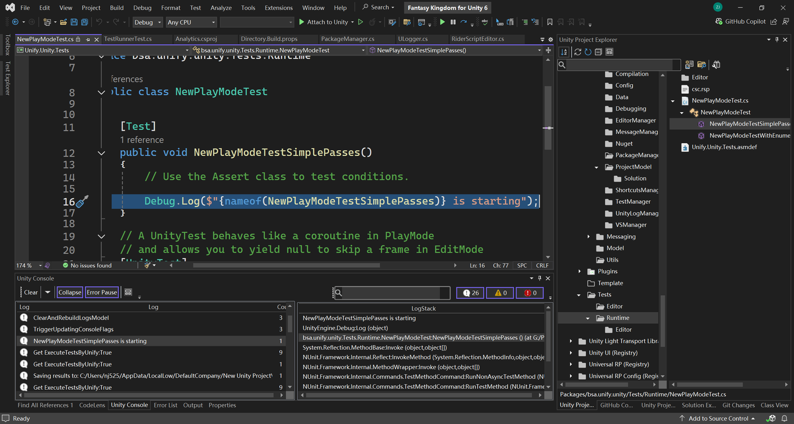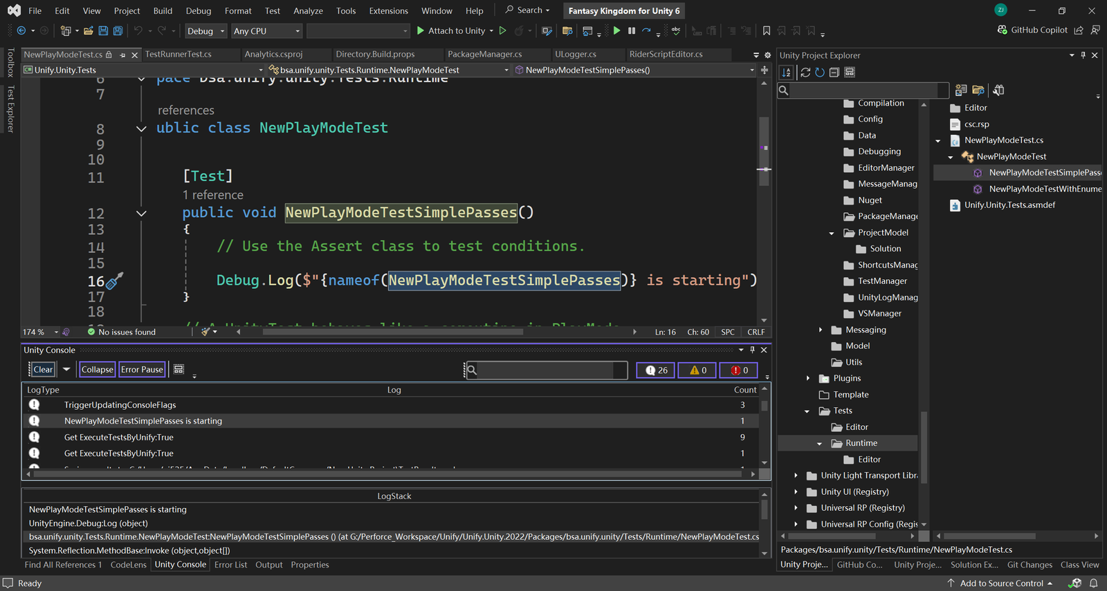The Unity Console tool window brings Unity’s Console Window into Visual Studio. The Unity Console Tool Window mirrors and enhances the functionality of the traditional Unity Console Window. Designed with developers in mind, this tool window offers seamless integration between Visual Studio and Unity’s logging system, allowing you to manage and control Unity’s console behavior directly from within your IDE.