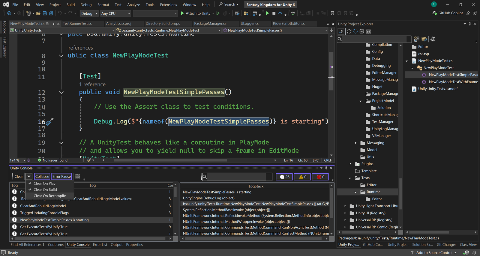 - Toggle Settings: Change core settings like Clear On Play, Clear On Build, Clear on Recompile, and Error Pause directly from Visual Studio, ensuring that your debugging environment is always tailored to your current workflow.