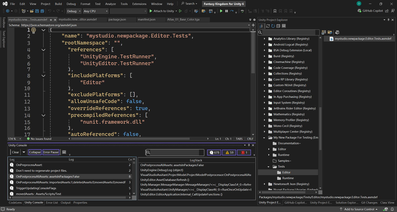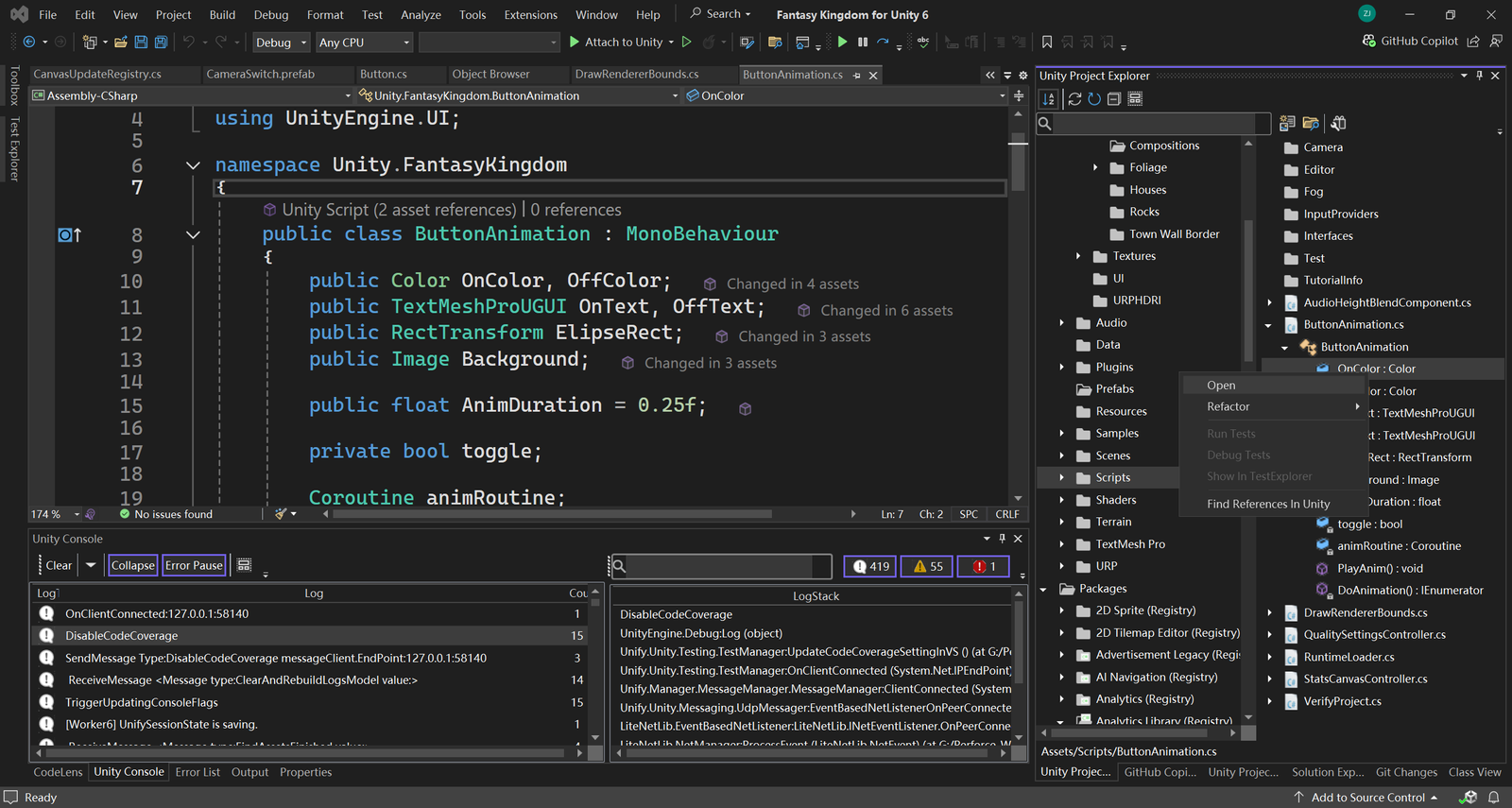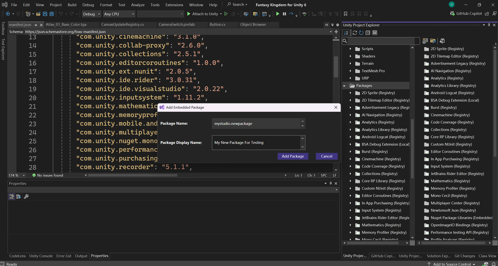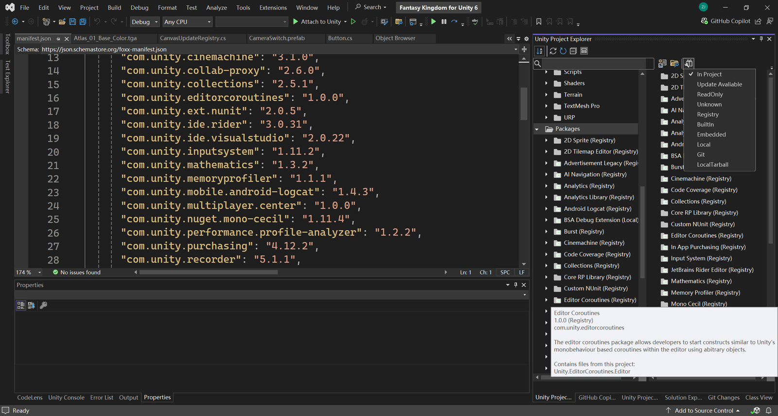 Unity Project Explorer displays all of the files related to your Project and is the main way you can navigate and manage Assets and Packages in Visual Studio, similar to the Project window in the Unity Editor.