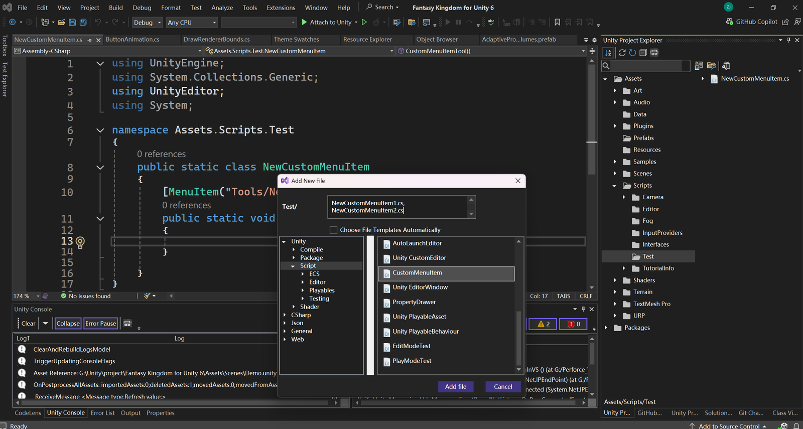 uSymphony offers a lot of file templates for creating Unity related files, such as Unity C# script, Unity unit tests, assembly definition files, and shader files. You can create new templates or edit existing templates to suit your need.